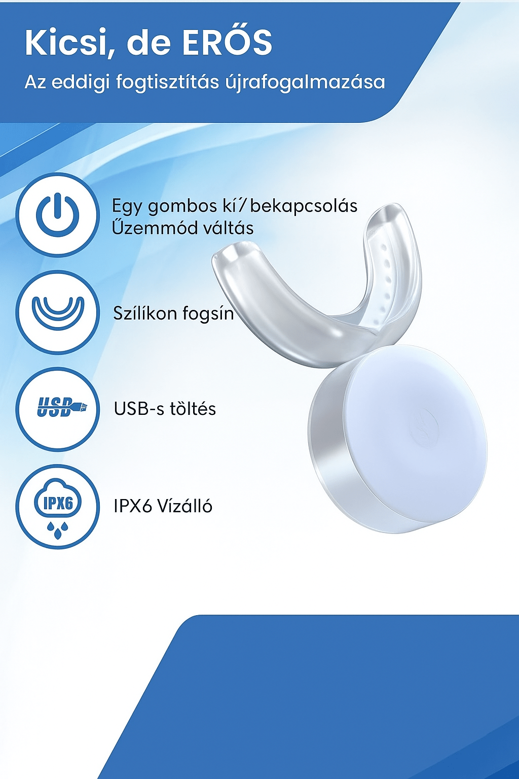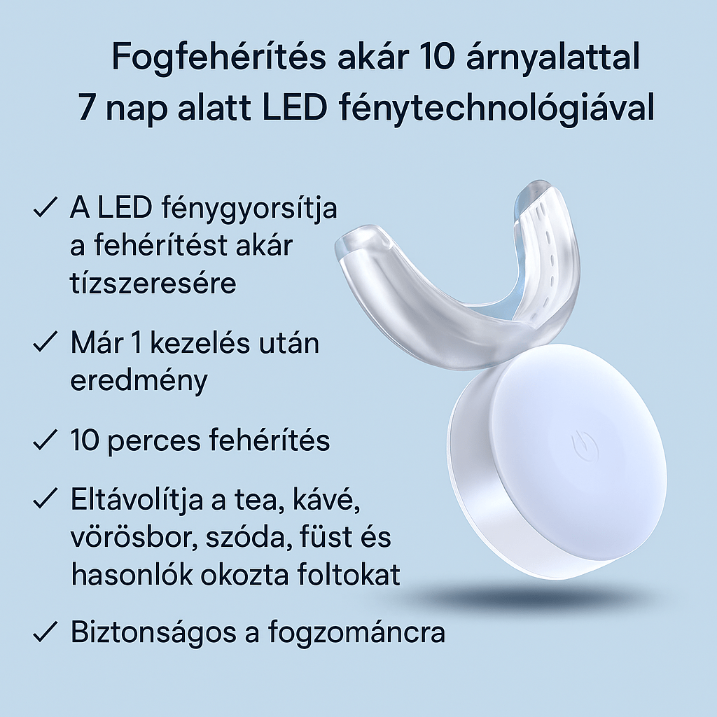 A készlet peroxidmentes PAP+ fogfehérítő gélt és 32 LED-es technológiát alkalmaz, így lehetővé teszi a látványos fehérítést anélkül, hogy agresszíven terhelné a fogzománcot vagy az ínyt.